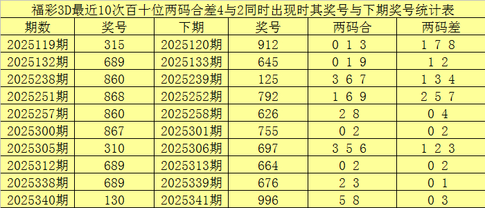 从以上统计不错看出,百十位两码合差4与2同期出现之后其下期两码合差阐扬最热的4个分手为:0123,本期百十位两码合差不错参考这四码中的数据。