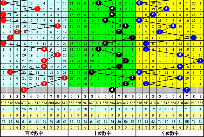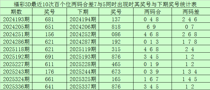 百个位合差分析:上期奖号百个位开出61组合,两码合为7,两码差为5,最近10次百个位两码合7与两码差5同期出当前,其奖号和下期奖号分手为: