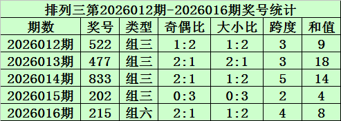 上期归来:摆设三第2026016期开奖号码为215。奖号类型为组六,奇偶比为2:1,大小比为1:2,跨度为4,和值为8。